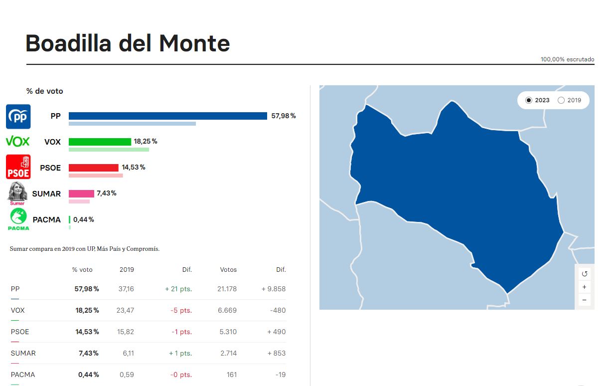 Boadilla del Monte (62.627 habitantes) ha sido el municipio de España que más ha incrementado el número de votos para el Partido Popular en las Elecciones Generales celebradas ayer. Un 57,98 % de los votantes eligieron esta opción frente al 37,16 % que lo hizo en 2019, lo que supone un incremento del 20,82 %.