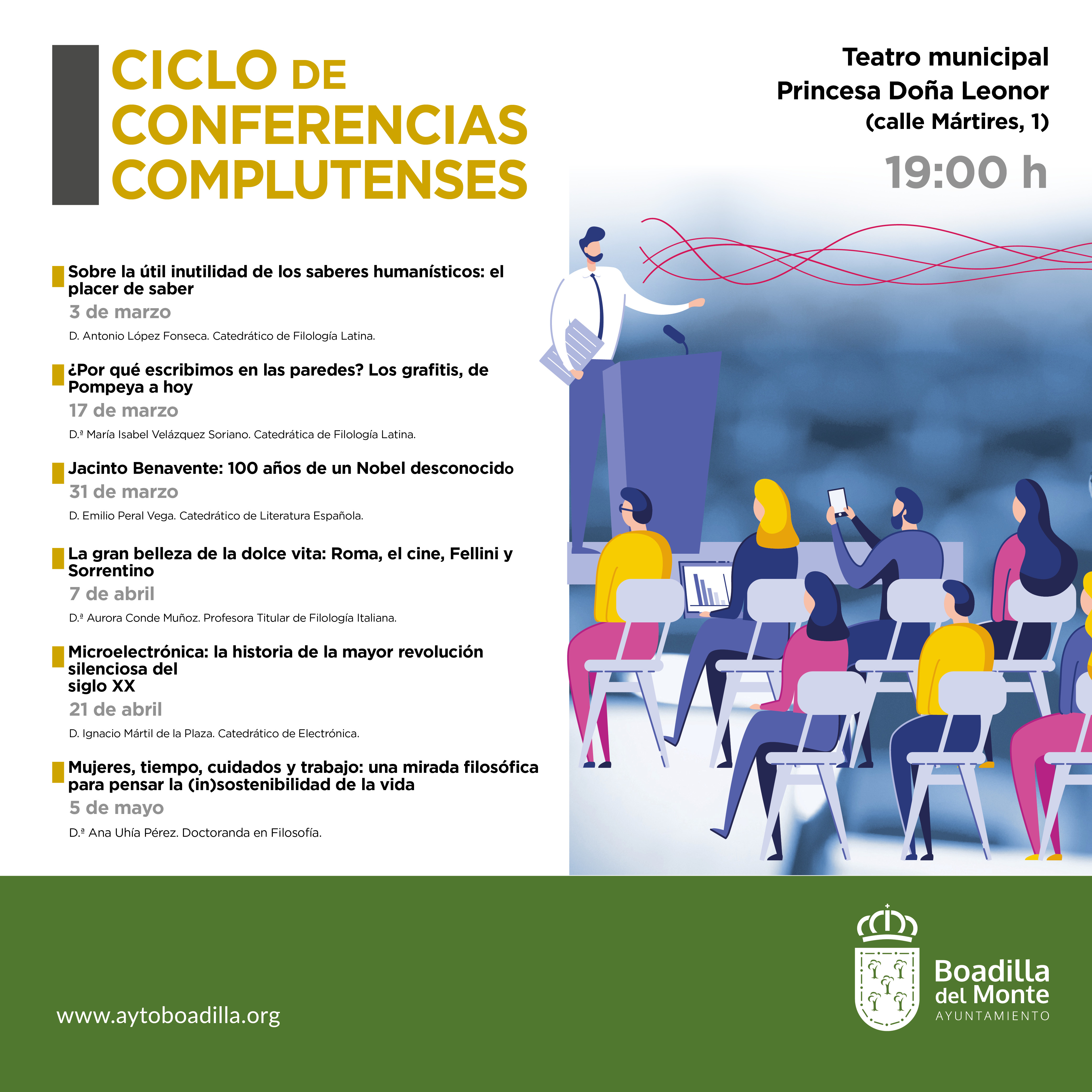 La Concejalía de Cultura inicia el próximo jueves día 3, a las 19:00 horas en el nuevo teatro Princesa Doña Leonor (Mártires, 1), el ciclo de conferencias Complutenses en Boadilla, que abordará desde el ámbito académico temas de interés general sobre cine, literatura, saberes humanísticos, microelectrónica y conciliación.