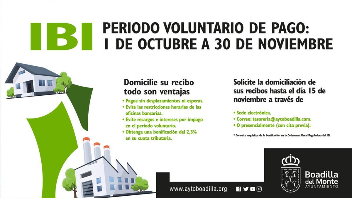 El Ayuntamiento de Boadilla del Monte recuerda a los contribuyentes que el periodo de pago voluntario del Impuesto sobre Bienes Inmuebles (IBI) finaliza el próximo 30 de noviembre, día en el que recibirán el cargo quienes lo tengan domiciliado en el banco.