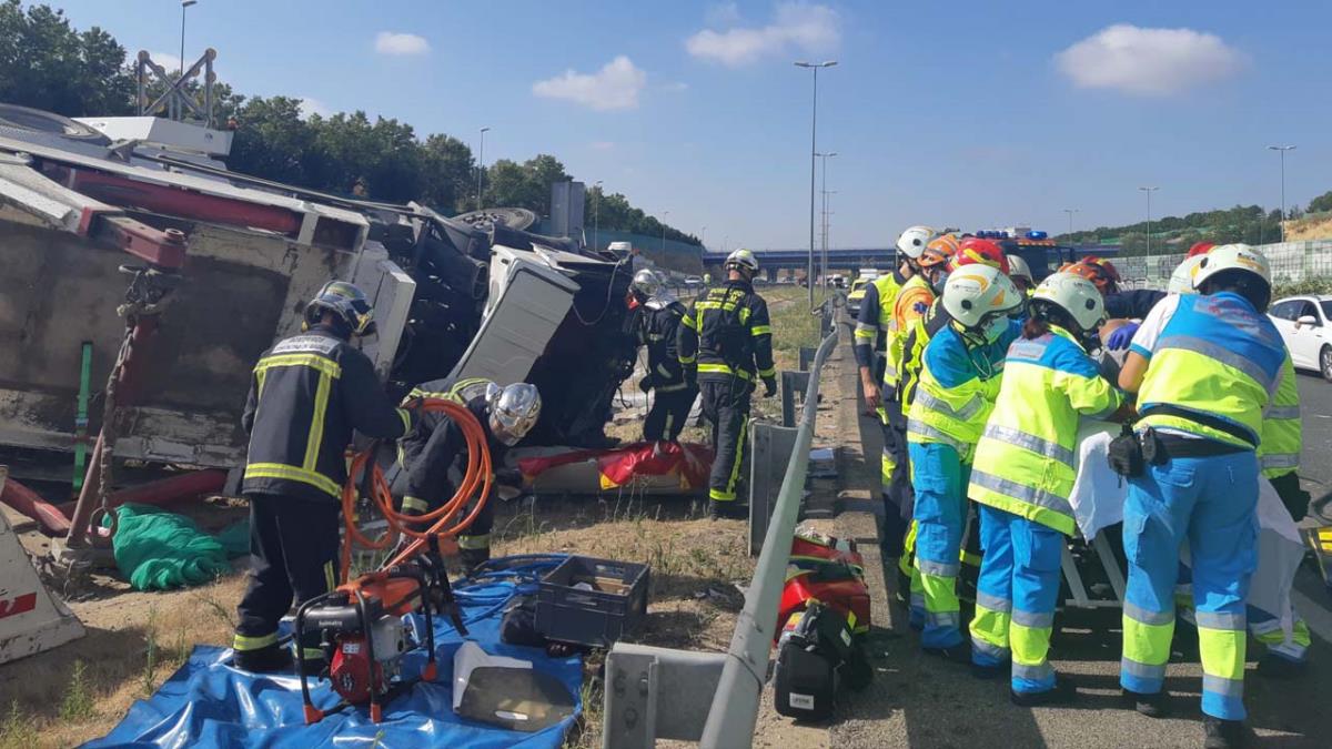 Un camión ha volcado esta mañana en la M-50, en el km 71 a la altura de Boadilla del Monte. El conductor, un varón de 26 años, quedaba atrapado en el vehículo. Los Bomberos de la Comunidad de Madrid, han podido rescatar al hombre y trasladarlo al Hospital Puerta de Hierro.