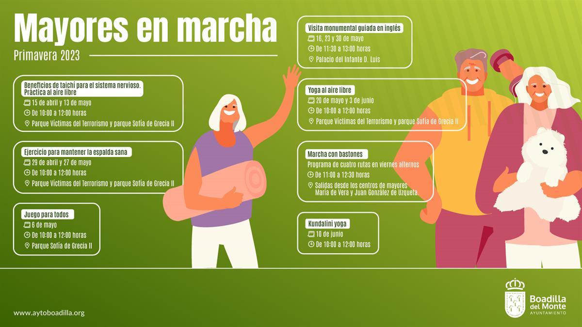 Yoga, taichí, sesiones para mejorar la salud de espalda, visitas guiadas en inglés y marcha con bastones son algunas de los talleres propuestos. El formato de las sesiones será de Masterclass, de dos horas de duración y abiertas a la participación de grupos amplios, pero siempre mediante inscripción previa en la concejalía a través del teléfono 91 343 20 90 o por e-mail en activ.mayores@aytoboadilla.com.