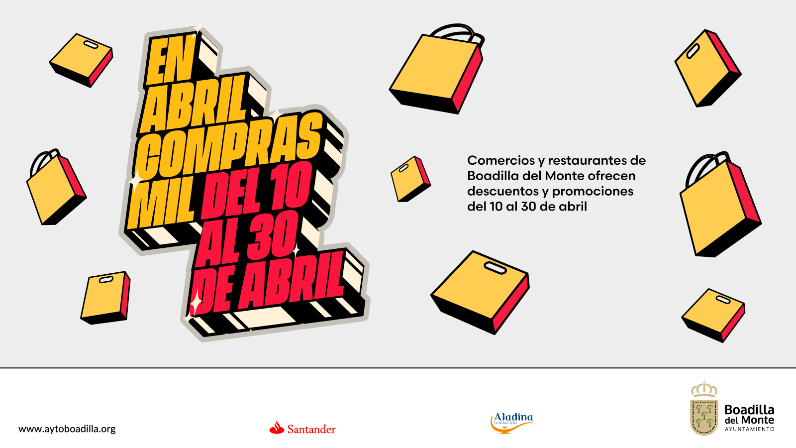 El ayuntamiento de Boadilla del Monte informa de que entre los días 10 y 30 de abril más de 80 comercios y restaurantes de Boadilla del Monte ofrecerán descuentos y promociones, en el marco de la campaña “En abril, compras mil”. En la campaña el ayuntamiento colabora de forma solidaria con la "Fundación Aladina", que trabaja a favor de los niños con cáncer y sus familias, proporcionándoles, a través de distintas iniciativas, apoyo emocional, psicológico y material.