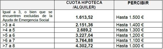 Los pagos para las familias que cumplan los requisitos serán, en función de las veces que superen el IPREM y el ingreso neto que tengan después de descontar hipoteca o alquiler, en un solo pago, los siguientes: