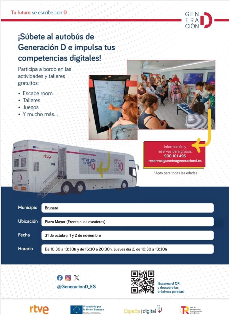 El Ayuntamiento de Brunete sigue promoviendo los conocimientos digitales. El 31 de octubre, el 1 y 2 de noviembre, visitará nuestra ciudad el autobús de Generación D, que ofrecer varias actividades interesantes como escape room, talleres, juegos y más. “Si el plan te gusta ven a disfrutarlo a las escaleras de la Plaza Mayor”, aseguran desde el Consistorio.