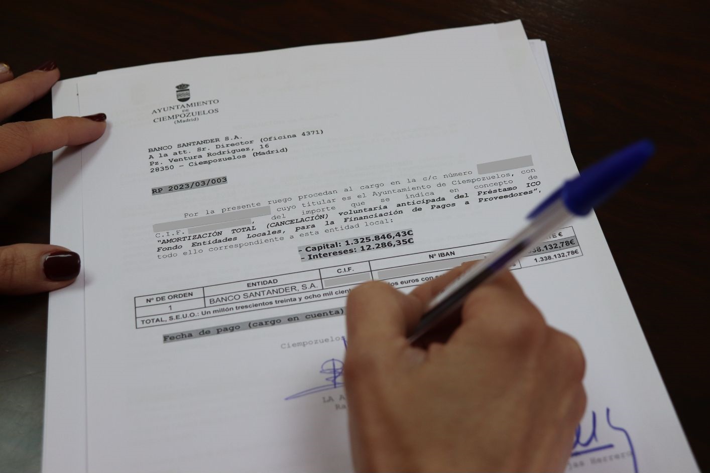 Raquel Jimeno, alcaldesa de Ciempozuelos, ha firmado el último pago de la deuda económica, que asciende a 1.325.846,43€, acabando así con el endeudamiento del Ayuntamiento de Ciempozuelos, que en 2012 aprobó un crédito de un total de 16.189.070€, sumándolo a más de 8 millones de deuda en suministro y otros créditos anteriores.