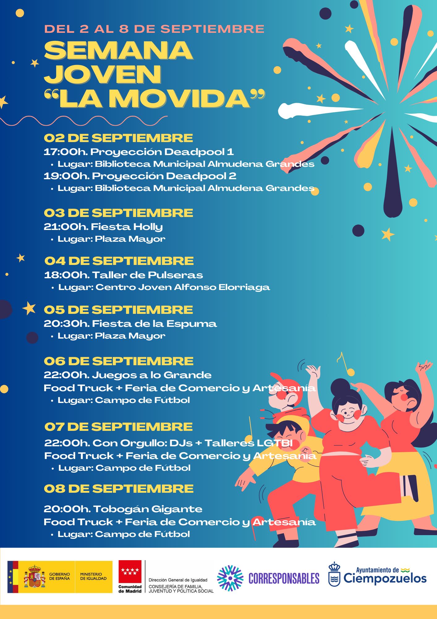 La Plaza Mayor (Las Palmeras) se convertirá en el epicentro de la diversión con las ya tradicionales Fiesta Holly (3 de septiembre a las 21:00h.) y Fiesta de la Espuma (5 de septiembre a las 20:30h.). Mientras que el Centro Joven Alfonso Elorriaga acogerá un Taller de Pulseras de la amistad intercambiables, el miércoles 4 de septiembre a las 18:00 horas.