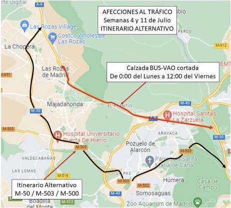 Como itinerario alternativo se recomienda el corredor M-50, M-503 y M-500