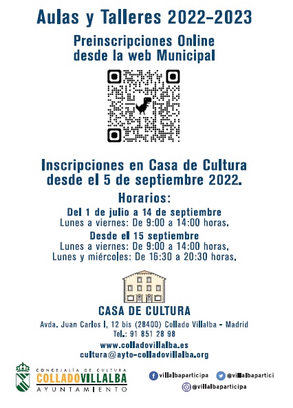 La Casa de la Cultura anuncia nuevos talleres para sus vecinos para el próximo curso 2022-2023. Para consultar la disponibilidad de los cursos se deberá llamar al 91 851 28 98, mientras que el periodo de inscripción será a partir del día 5 de septiembre. Se deberá descargar la ficha de inscripción, cumplimentarla y entregarla en la Casa de Cultura.