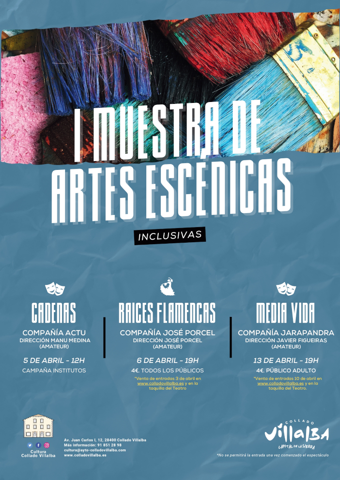 El Ayuntamiento de Collado Villalba organiza, por primera vez, la Muestra de Artes Escénicas Inclusivas, que se celebrará del 5 al 13 de abril en el Teatro Municipal de Casa de Cultura de Collado Villalba, con el fin de ofrecer espectáculos inclusivos y mostrar a la sociedad que la cultura es el mejor vehículo para manifestar las verdaderas capacidades de las personas.