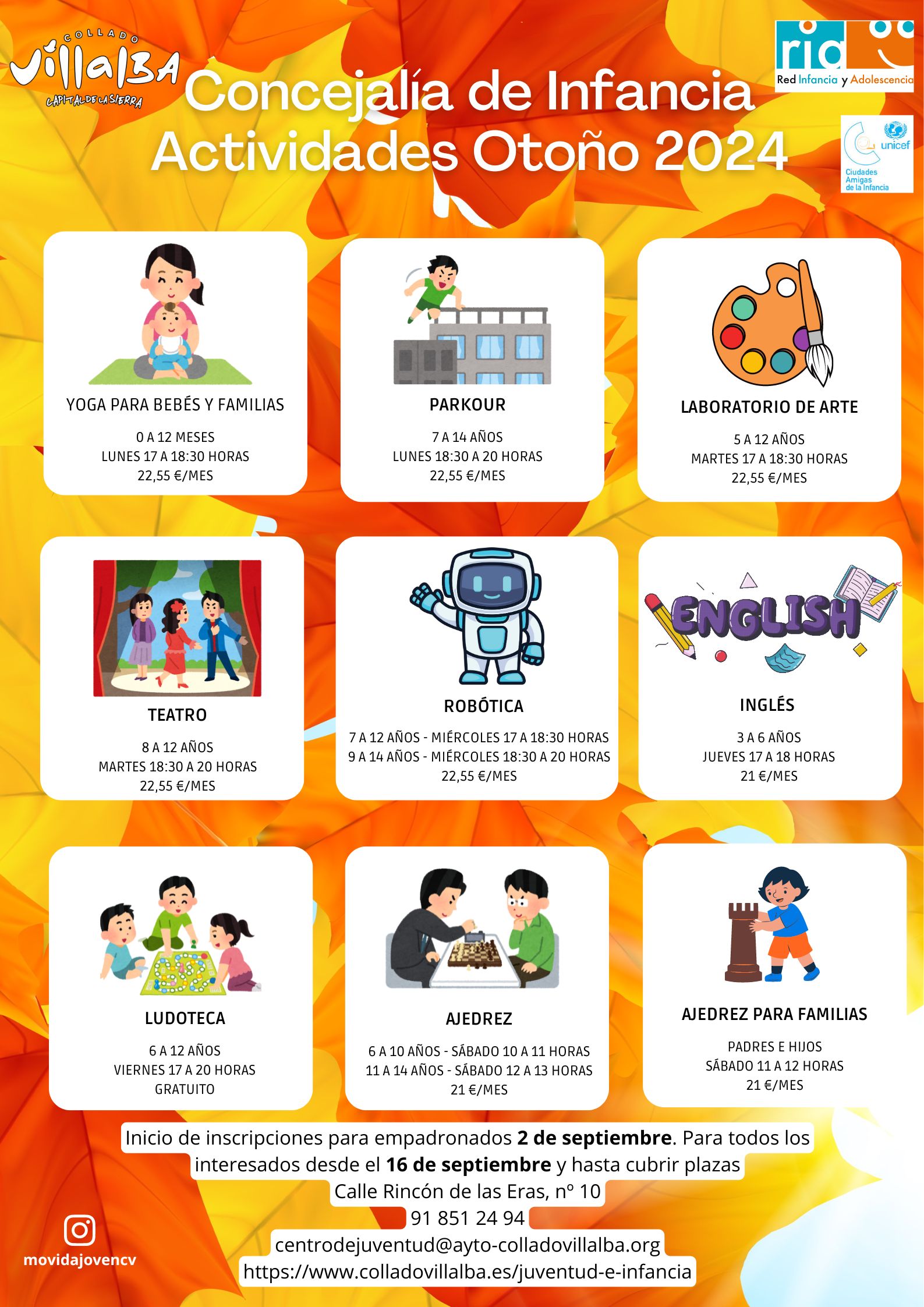 El plazo de inscripción comienza el 2 de septiembre para los empadronados en Collado Villalba y a partir del 16 de septiembre para todos los interesados, y se pueden realizar a través de la página web del Ayuntamiento, en el apartado del servicio municipal de Infancia y Juventud. También se pueden gestionar presencialmente en el Centro de Juventud. El aforo de las actividades es limitado.