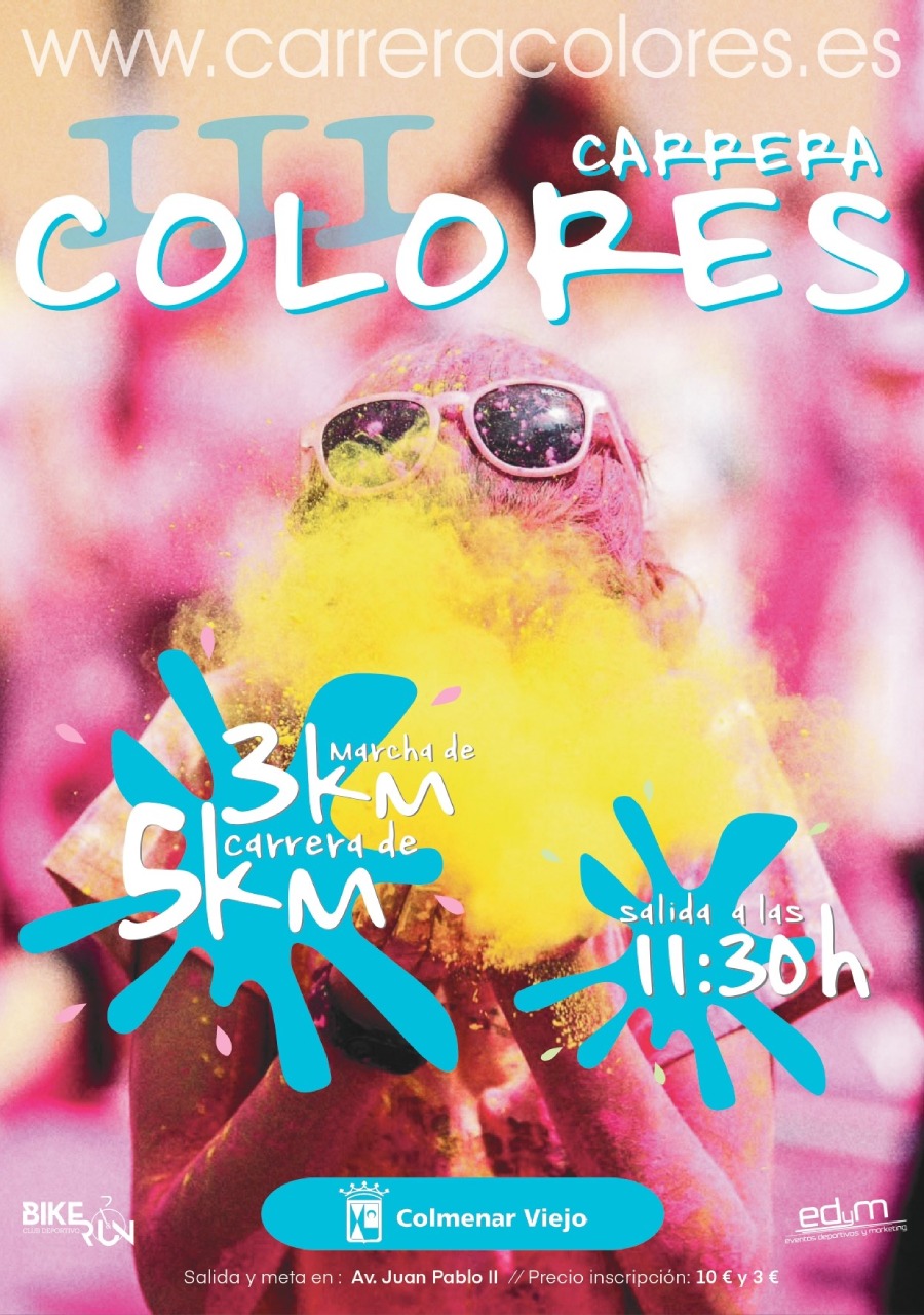 El Ayuntamiento de Colmenar Viejo ha abierto la inscripción para participar en la III Carrera de Colores, que se celebrará el 15 de mayo. La salida y meta se hará en la avenida Juan Pablo II. La hora de salida se dará a las 11:30 horas, junto al Edificio Municipal de la Estación.