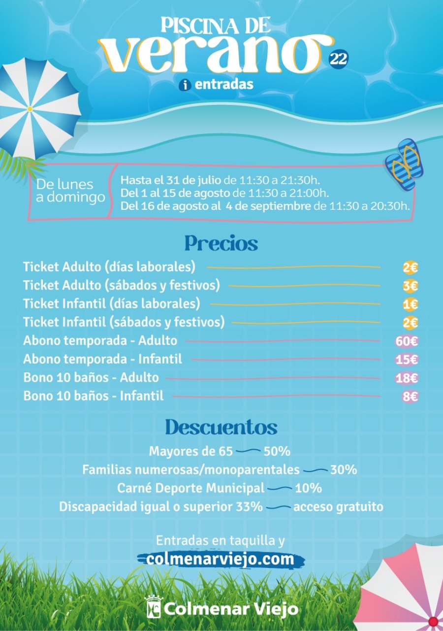 La apertura de la piscina municipal de verano de Colmenar Viejo se realizará el próximo 11 de junio y cerrará sus puertas el 4 de septiembre. El Ayuntamiento ultima los trabajos de mantenimiento y mejora de las instalaciones, para poner a punto el recinto. Dispone de servicio de venta de entradas online y préstamo gratuito de libros con “Libros al Agua”.