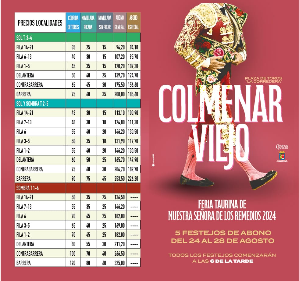 Los festejos de abono se celebrarán del 24 al 28 de agosto, y contará con tres corridas de toros, una novillada picada y una novillada sin picadores, comenzando todos ellos a las 18:00h.