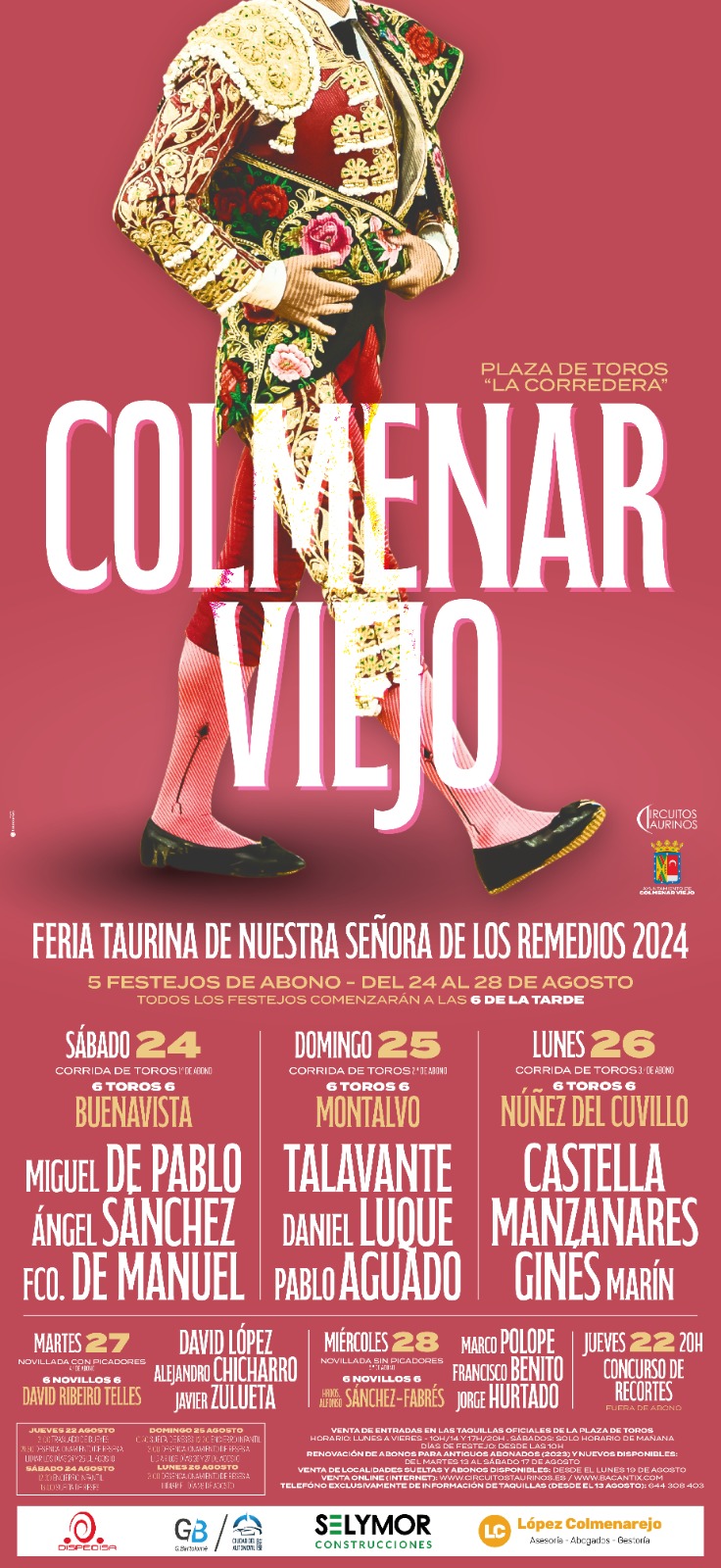 Se ha presentado el cartel de la Feria Taurina de Nuestra Señora de los Remedios 2024, con la presencia del alcalde de Colmenar Viejo, Carlos Blázquez Rodríguez; el quinto teniente de alcalde y concejal de Asuntos Taurinos, Felipe Mansilla Nogales, y el empresario Carlos Zúñiga González (responsable de Circuitos Taurinos, empresa concesionaria de la Plaza de Toros ‘La Corredera’). El acto ha sido presentado por la periodista taurina Vanesa Santos Linares, y el pregonero ha sido el ganadero colmenareño, Manuel Sanz de la Morena (‘Los Eulogios’).