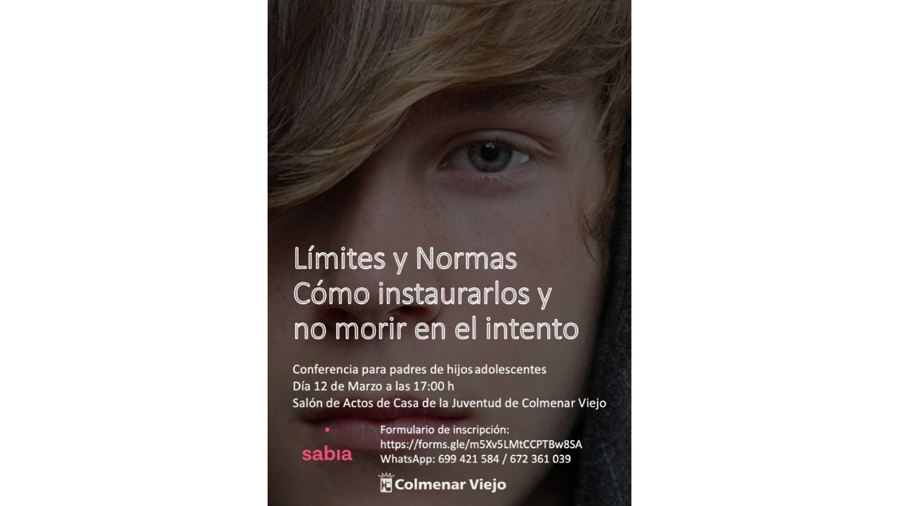 El Ayuntamiento de Colmenar Viejo abre la inscripción para asistir a la conferencia bajo el nombre de `Límites y normas. Cómo instaurarlas y no morir en el intento´. La charla está organizada por La Concejalía de Seguridad Ciudadana y las Concejalías de Educación y de Juventud e Infancia, va dirigida a padres tutores y educadores de adolescentes.