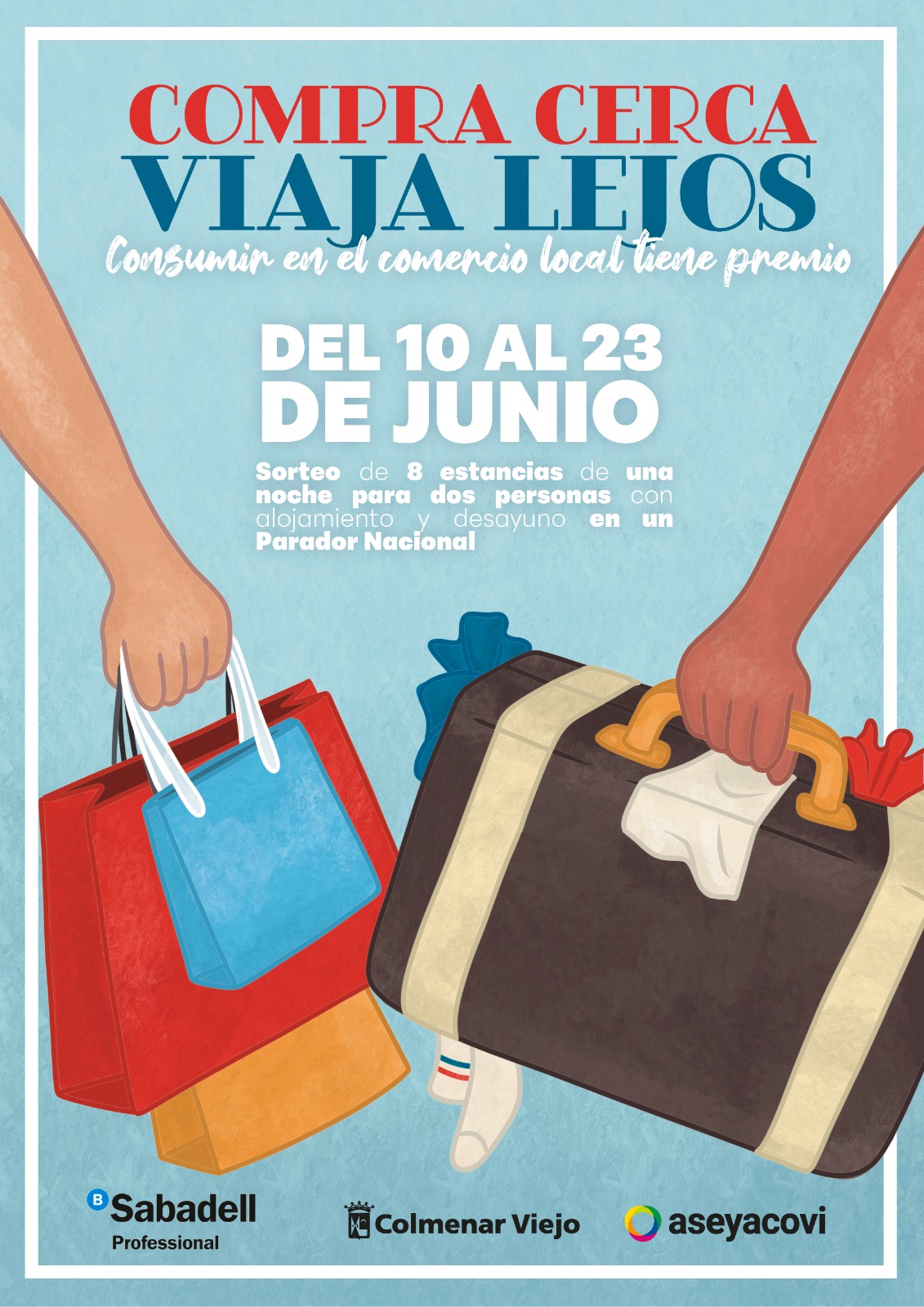 El Ayuntamiento de Colmenar Viejo y ASEYACOVI ponen en marcha la campaña ‘Compra cerca, viaja lejos’, que tiene como objetivo dinamizar las compras en los comercios locales mediante el sorteo de ocho estancias de una noche para dos personas con alojamiento y desayuno en un Parador Nacional.