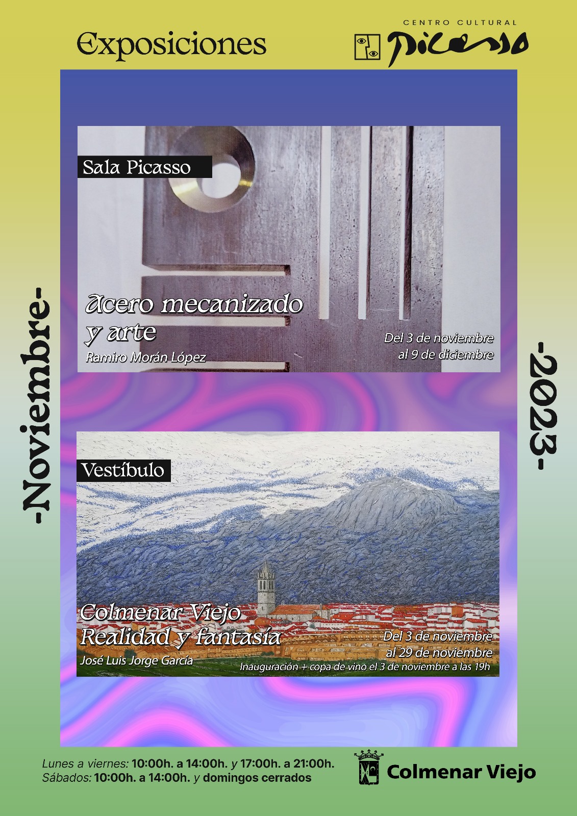 La Concejalía de Cultura presenta las exposiciones "Acero Mecanizado y Arte" y "Colmenar Viejo, Realidad y Fantasía" en el Centro Cultural Picasso durante este mes de noviembre, en horario de lunes a viernes de 10:00 a 14:00h y de 17:00 a 21:00h, sábados de 10:00 a 14:00h.