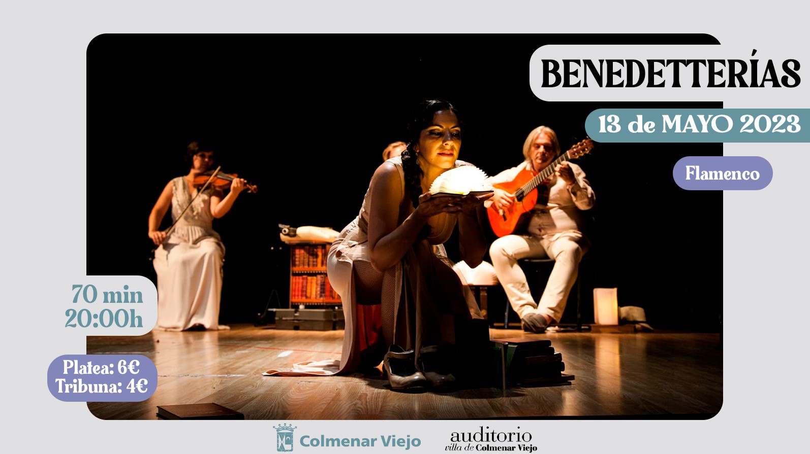 Continuando en el Villa de Colmenar Viejo, el sábado a las 20:00h. flamenco con el espectáculo Benedetterías de Antritrán Compañía Flamenca. Entradas: Platea: 6 euros | Tribuna: 4 euros