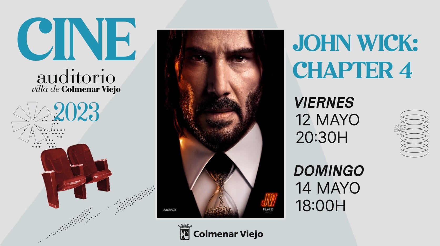 Cine en el Auditorio con sesiones el viernes (20:30h.) y el domingo (18:00h.) con la película John Wick 4, thriller de acción protagonizado por Keanu Reeves. Entradas: 3 euros.