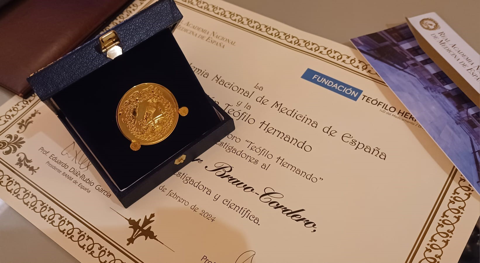 A la finalización de la conferencia, se le hizo entrega de la medalla y el diploma acreditativo como miembro del Foro ‘Teófilo Hernando’ de Jóvenes Investigadores de la Real Academia Nacional de Medicina de España.