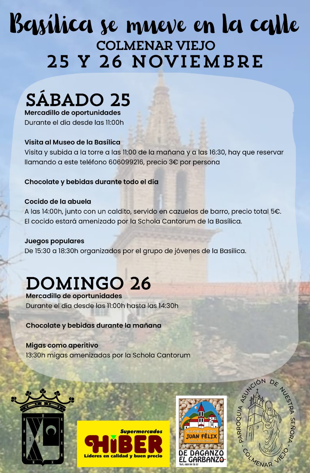 • Cocido de la abuela – Cocido con caldito, servido en cazuelas de barrio, amenizado por la música de la ‘Schola Cantorum’ de la Basílica. Comida a las 14:00h y con un coste de 5 euros por persona.