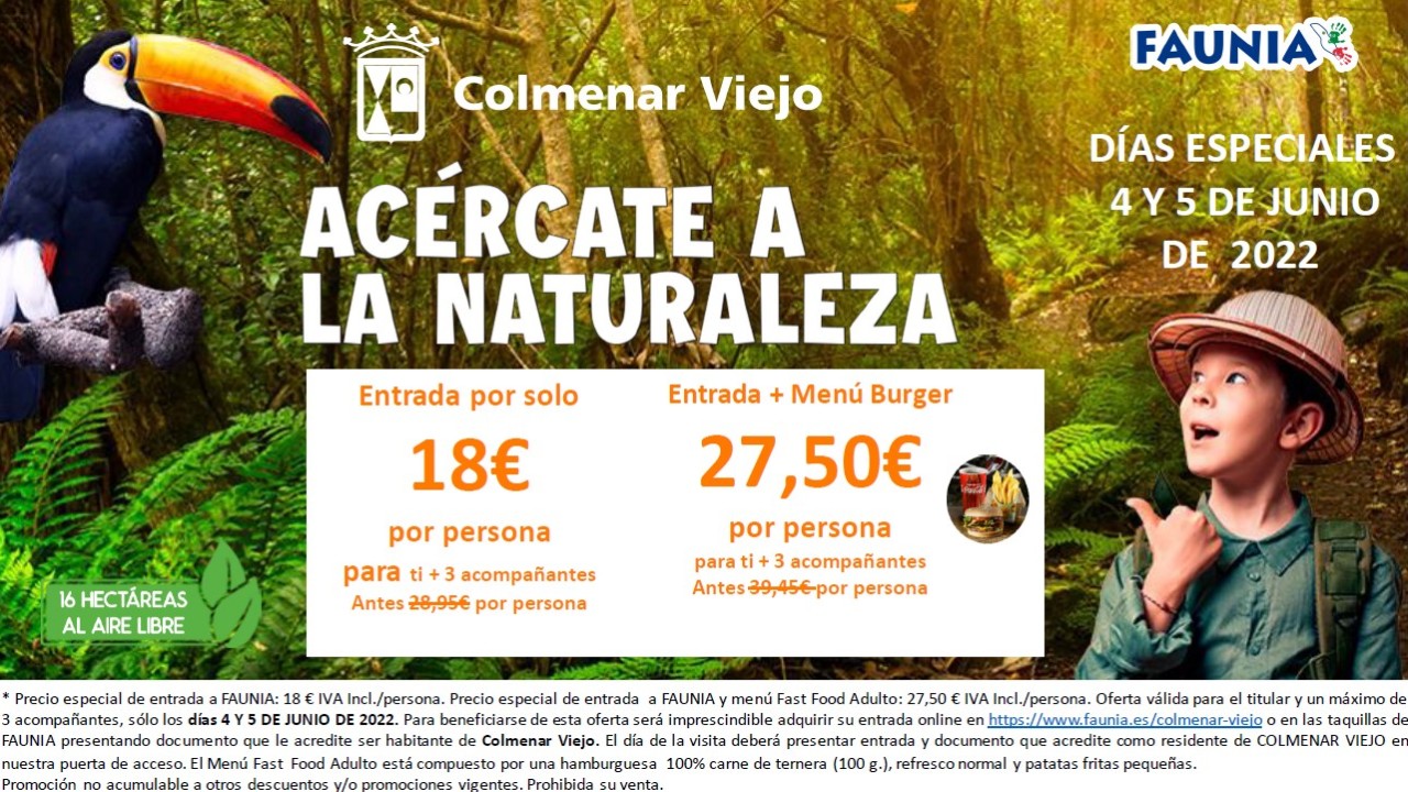 Este fin de semana, los colmenareños disfrutan de precios especiales en Faunia, el parque temático de la naturaleza, que cuenta con más 3.000 animales de 300 especies diferentes y 16 hectáreas al aire libre. Los días 4 y 5 de junio la entrada tendrá un precio de 18 € por persona (precio en taquilla sin promoción 29,95 €), y la opción de entrada más menú fast food tiene un precio de 27,50 €. Los tickets pueden adquirirse en taquilla o en el enlace www.faunia.es/colmenar-viejo