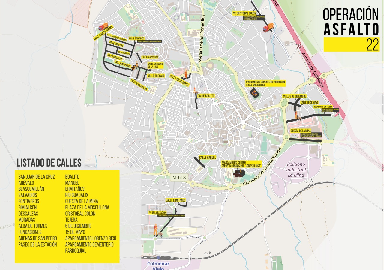 El pleno del Ayuntamiento de Colmenar Viejo aprueba la licitación para el asfaltado de 95.000 metros cuadrados de pavimento y un presupuesto de 1.499.580,46 euros. La Operación Asfalto 2022 renovará 21 calles y dos grandes aparcamientos de superficie. Es la más extensa proyectada en el municipio y supera a la del año anterior. El plazo ejecución es de tres meses.