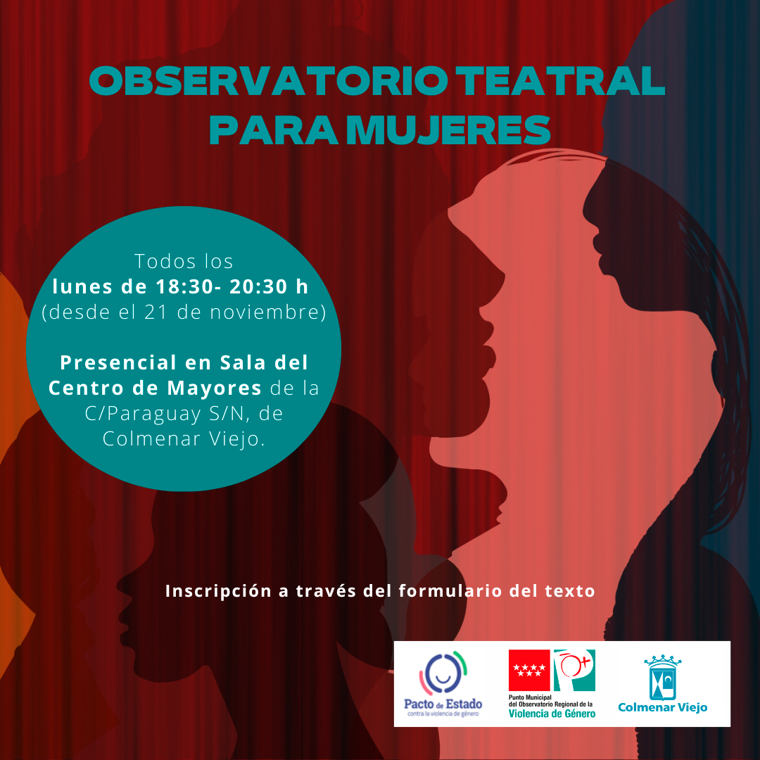 El Observatorio Teatral para Mujeres, un nuevo taller de teatro gratuito destinado a las colmenareñas, abre su periodo de inscripción. El desarrollo de esta iniciativa, llevada a cabo por la Concejalía de Igualdad junto al PMORVG, partirá de situaciones que se presenten durante el proceso, decidiendo entre todas las participantes sobre qué hablar y trabajar. Se irá creando y componiendo una pieza teatral a través de la investigación y la documentación sobre el tema.