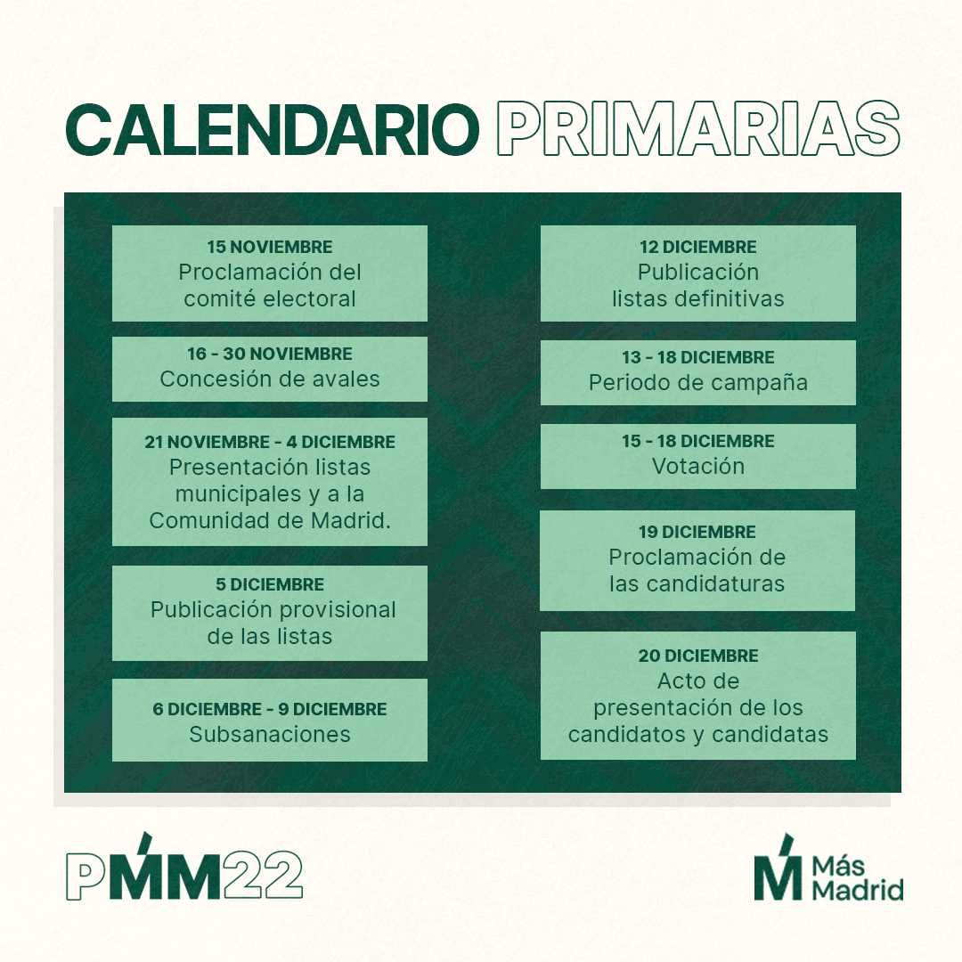 Más Madrid ha anunciado que será en el mes de diciembre cuando celebre su proceso de primarias para configurar las listas definitivas que se presentarán a las elecciones automáticas y municipales del 27 de mayo de 2023. Las votaciones concluirán entre los días 15 y 18 de diciembre donde toda la militancia del partido podrás votar tanto las cabezas de lista como el resto de candidatos que aparecerán en las papeletas electorales.