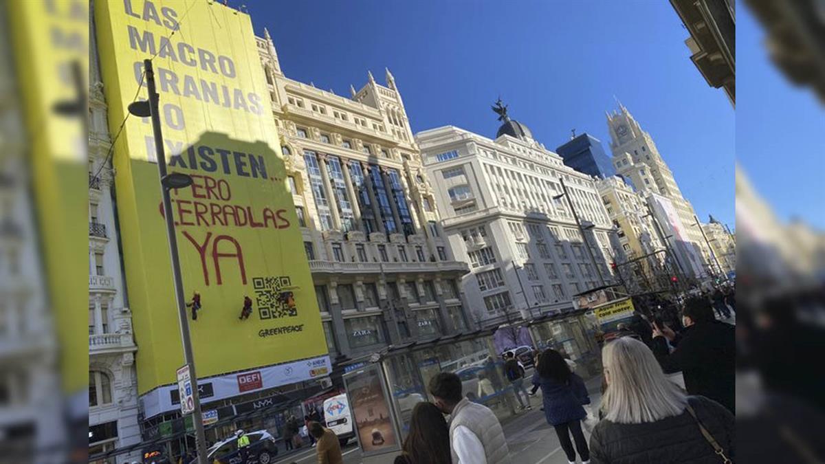 Activistas de Greenpeace se han colgado hoy en una fachada de la Gran Vía de Madrid para pedir el fin de la ganadería industrial y el cierre de las macrogranjas. La organización colocó allí este martes una lona, de más de 30 metros, con la frase “las macrogranjas no existen”, en clara alusión a las declaraciones que algunos políticos están realizando estos días. Hoy han completado la acción rematando el mensaje: “Las macrogranjas no existen, pero cerradlas ya!”
