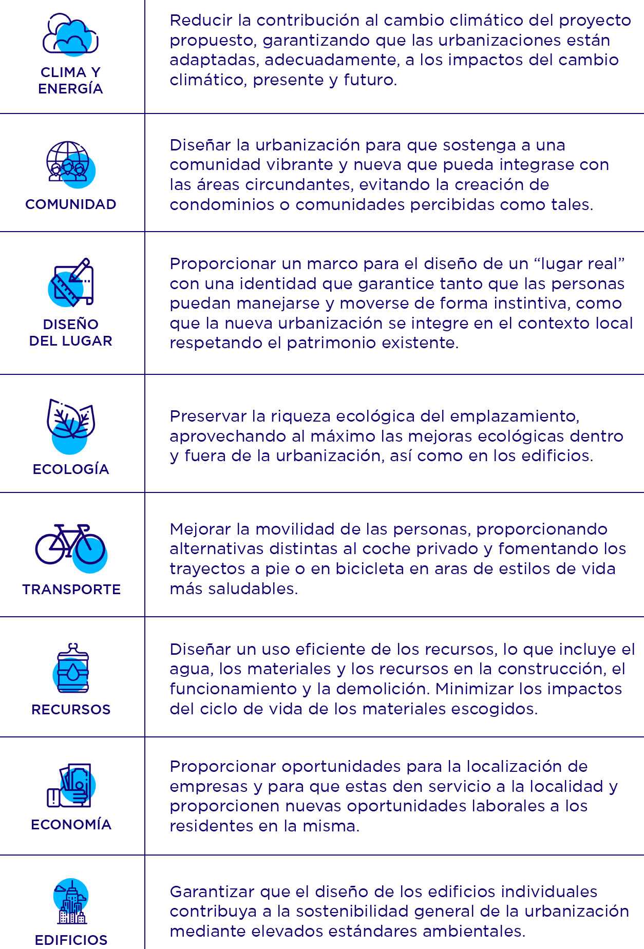 Las construcciones, con reducción de huella de CO2 y energías renovables, se rigen por la sostenibilidad, conectividad, protección de la seguridad y respeto del entorno. Uno de los principales ejes de actuación es la edificación de inmuebles de consumo energético neto cero. Con un diseño de bajo impacto que permite la conservación del paisaje, las casas -con amplias zonas ajardinadas- constan de novedades tecnológicas como la simulación de presencia, sensorización luminaria, riego inteligente, autogestión del consumo, recarga de vehículos eléctricos, confort térmico, control de residuos, conectividad integral y sistema de gestión fotovoltaico. El sistema de ciberseguridad perimetral, por su parte, controlará el acceso a viviendas y las posibles intrusiones a través de toda la Urbanización.