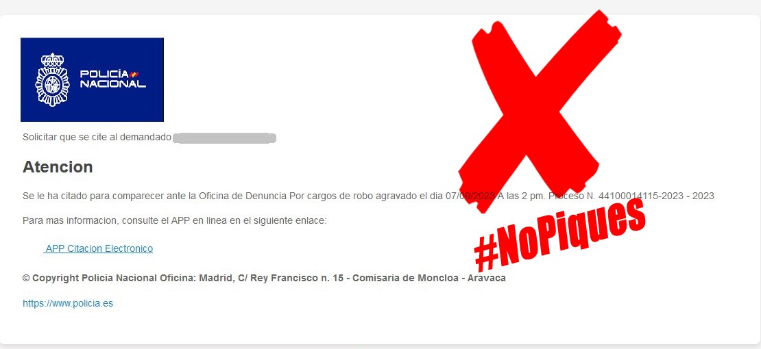 La Unidad Central de Ciberdelincuencia de la Policía Nacional tiene, entre otros objetivos, evitar la propagación, difusión e infección de equipos TIC con software malicioso. Enmarcada en esa función, los ciberagentes han detectado el envío de correos electrónicos haciéndose pasar por la Policía Nacional. En el email, los cibercriminales citan a las víctimas para comparecer supuestamente ante la Oficina de Denuncias por “cargos de robo agravado”.