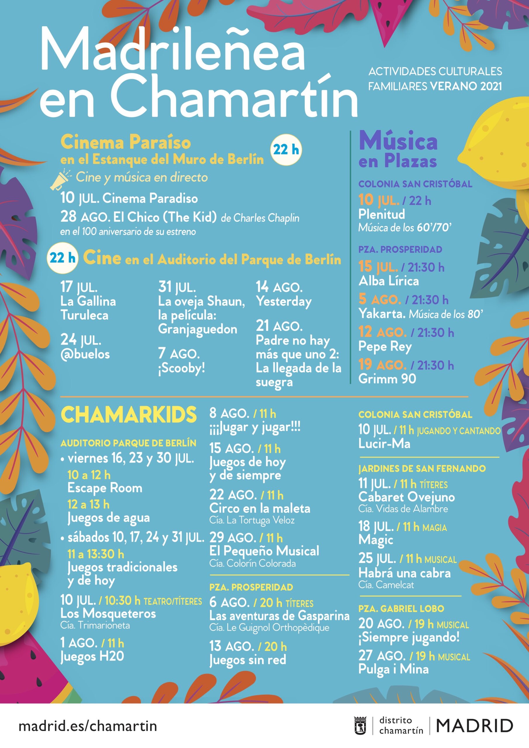 El público infantil tendrá una cita todos los sábados de julio y domingos de agosto con ChamarKids, una serie de actividades diseñadas en diferentes puntos del distrito en la que se mezclan, en inglés, juegos tradicionales con los de hoy para fomentar el bilingüismo desde edades tempranas. En concreto, los viernes 16, 23 y 30 de julio con escape room y juegos de agua y los sábados de julio y los domingos de agosto con juegos tradicionales en el parque de Berlín. La magia tendrá también su espacio. Será el 18 de julio, en los jardines de San Fernando, cuando grandes y pequeños disfruten del espectáculo Magic.