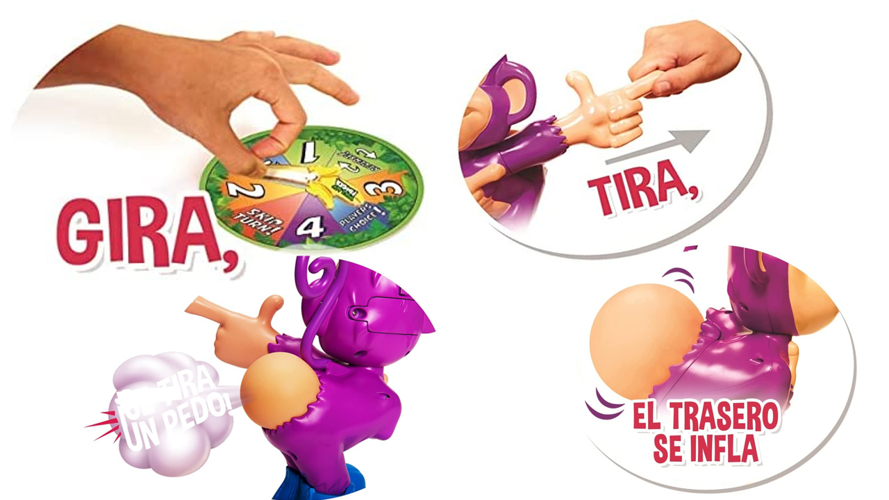 Este juego deja en claro dos cosas: Que Bizak no paga a expertos en rima y que existe cierta obsesión por las cosas que desprendemos por el ano. Esta vez dejamos los sólidos y nos aferramos a una broma clásica: Tírame del dedo. Tan sencillo y absurdo que funciona, no necesita más. Giras la ruleta y tiras tantas veces como te toque, si el mono suelta un pedo, pierdes.