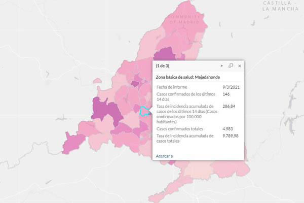 Según un el Informe Epidemiológico publicado por el gobierno regional, la tasa de incidencia acumulada de la región es de 112,8, siendo Leganés el municipio con mas de 100.000 habitantes con mejores cifras, con una IA de 62,7, y 119 casos positivos confirmados en esta última semana. Sin embargo, Majadahonda se lleva las peores cifras, con una IA de 160,1, y 115 casos.