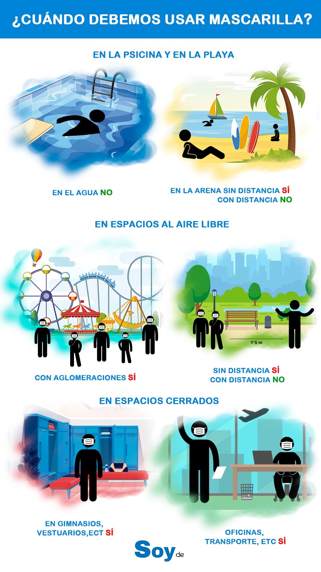 Si estás planificando tus vacaciones ten en cuenta, no sólo el transporte, sino también que en playas y piscinas no es obligatorio siempre que no se produzcan aglomeraciones al aire libre y, por supuesto, en zonas comunes cerradas sigue siendo un requisito. Como, por ejemplo, en el interior de bares, restaurantes o chiringuitos, menos cuando se esté consumiendo.
