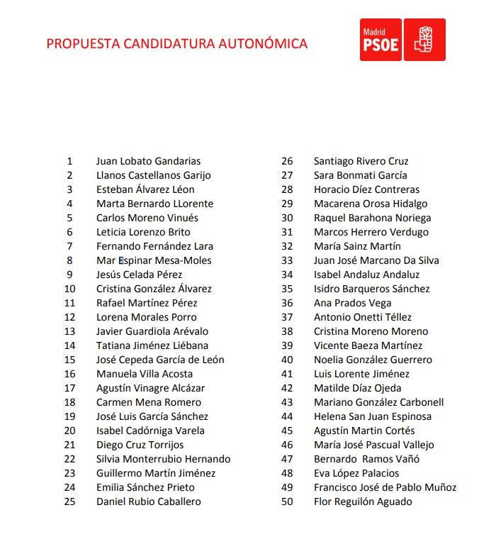 Desaparecen nombres importantes como los de Hana Jalloul, Irene Lozano, Mónica Carazo, Pilar Sánchez Acera, Pilar LLop, Carmen Barahona y se da paso a personas que representan la nueva dirección del proyecto de Lobato centrado en la recuperación de los servicios públicos sobre todo en Educación y Sanidad. Así como número 3 irá Esteban Álvarez, presidente de la Asociación de Directores de Institutos Públicos de Madrid, una apuesta del socialista por reformar el sistema educativo que Ayuso ha implantado en nuestra región donde se prioriza la educación concertada y privada. Para los socialistas es fundamental volver a impulsar la pública con recursos suficientes que doten a nuestros colegios e institutos de todo lo necesario para impartir una educación de calidad y gratuita. Como número 4 va Marta Bernardo, secretaria de Organización del PSOE-M tras la victoria de Lobato en las primarias. Y le siguen Carlos Moreno, cirujano del Hospital de Getafe y Leticia Lorenzo, economista del equipo económico de la ejecutiva socialista. En el puesto 7, se sitúa Fernando Fernández Lara, seguido de otra novedad, Mar Espinar que cambia el pleno del Ayuntamiento de Madrid por la cámara regional. Destaca también la inclusión de Rafael Martínez, alcalde de San Martín de la Vega, regidor más votado en la región en las últimas elecciones municipales.