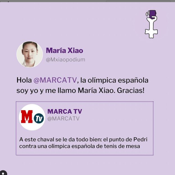 Por otra parte, dos futbolistas de la Selección en los Juegos echaron un partido al tenis de mesa en parejas con las dos deportistas que representan a España en esta disciplina, siendo la pareja de Dvorak-Dani Olmo y Maria Xiao-Pedri. El Marca, por su parte, señaló que “A este chaval se le da todo bien: el punto de Pedri contra una olímpica española de tenis de mesa”. Donde no puso el nombre de Maria Xiao, y dio importancia al futbolista. A esto responidó María Xiao diciendo que la atleta olímpica era ella.