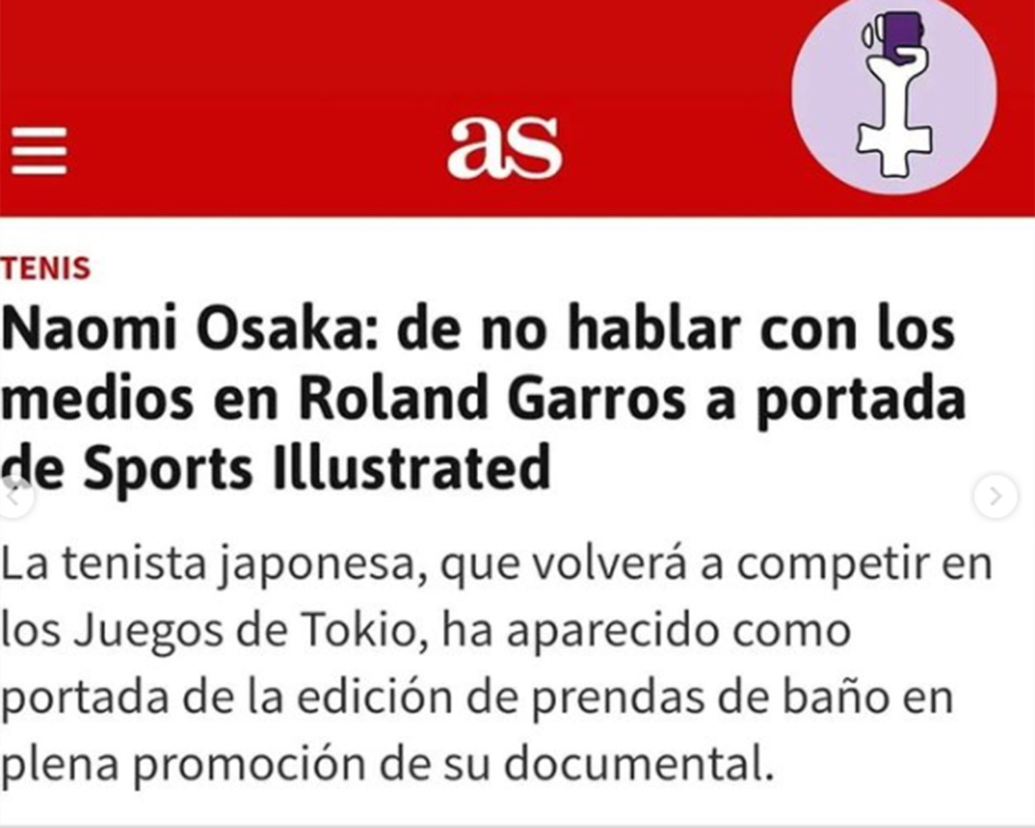 Otra de las situaciones más machistas es que Naomi Osaka, una de las mejores tenistas, tuvo que retirarse en Roland Garros porque debía cuidar de su salud mental. Ahora, ha aparecido de nuevo en la prensa, pero esta vez por una edición de prendas de baño, y el medio AS lo señalaba así: “Naomi Osaka: de no hablar con los medios en Roland Garros a portada de Sports Illustrated”.