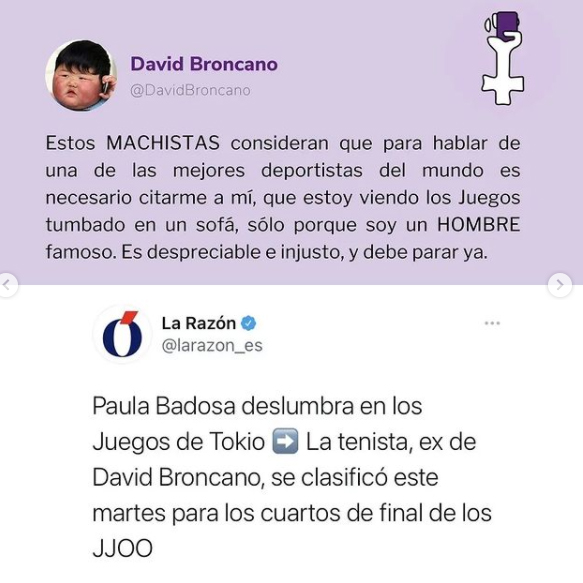 “Paula Badosa deslumbra en los Juegos de Tokio. La tenista, ex de David Broncano, se clasificó este martes para los cuartos de final de los JJOO”, decía La Razón. Broncano es un cómico reconocido en España, quien rápidamente condenó este hecho a través de sus redes: “Estos MACHISTAS consideran que para hablar de una de las mejores deportistas del mundo es necesario citarme a mí, que estoy viendo los Juegos tumbado en un sofá, sólo porque soy un HOMBRE famoso. Es despreciable e injusto, y debe parar ya”.