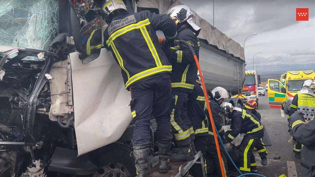Dos camiones colisionan en la M-50, a la altura de Paracuellos del Jarama, en Madrid. Han lugar se han trasladado los sanitarios del SUMMA 112, la Guardia Civil y los bomberos.