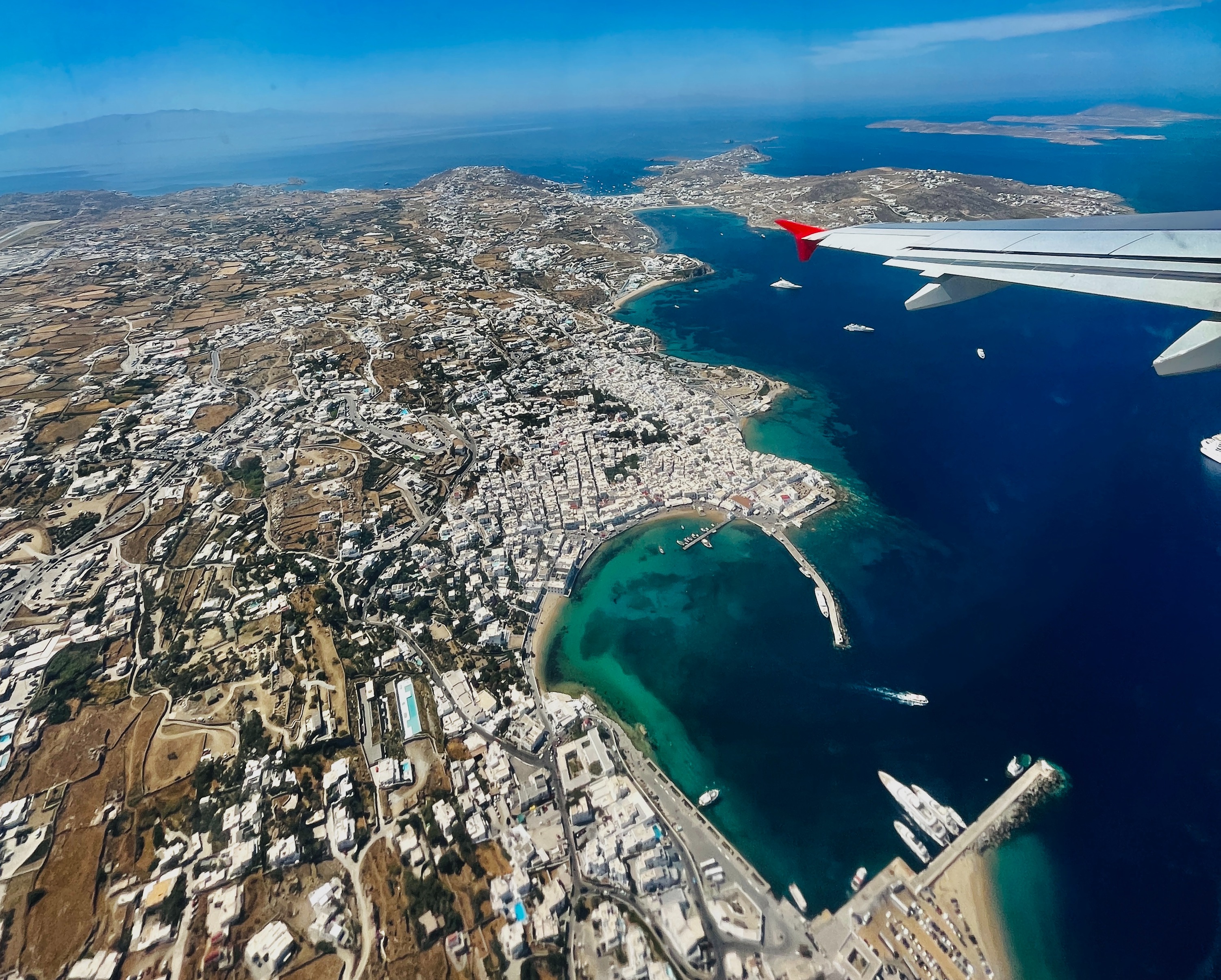 El viaje de Atenas hasta la isla lo hicimos en avión. Después de asarnos como pollos los tres días en la capital, ver desde la ventana del avión esas aguas cristalinas y las playas de Mykonos fue como un chute de energía. Lo primero que hicimos al llegar fue precisamente eso: ir a la playa.