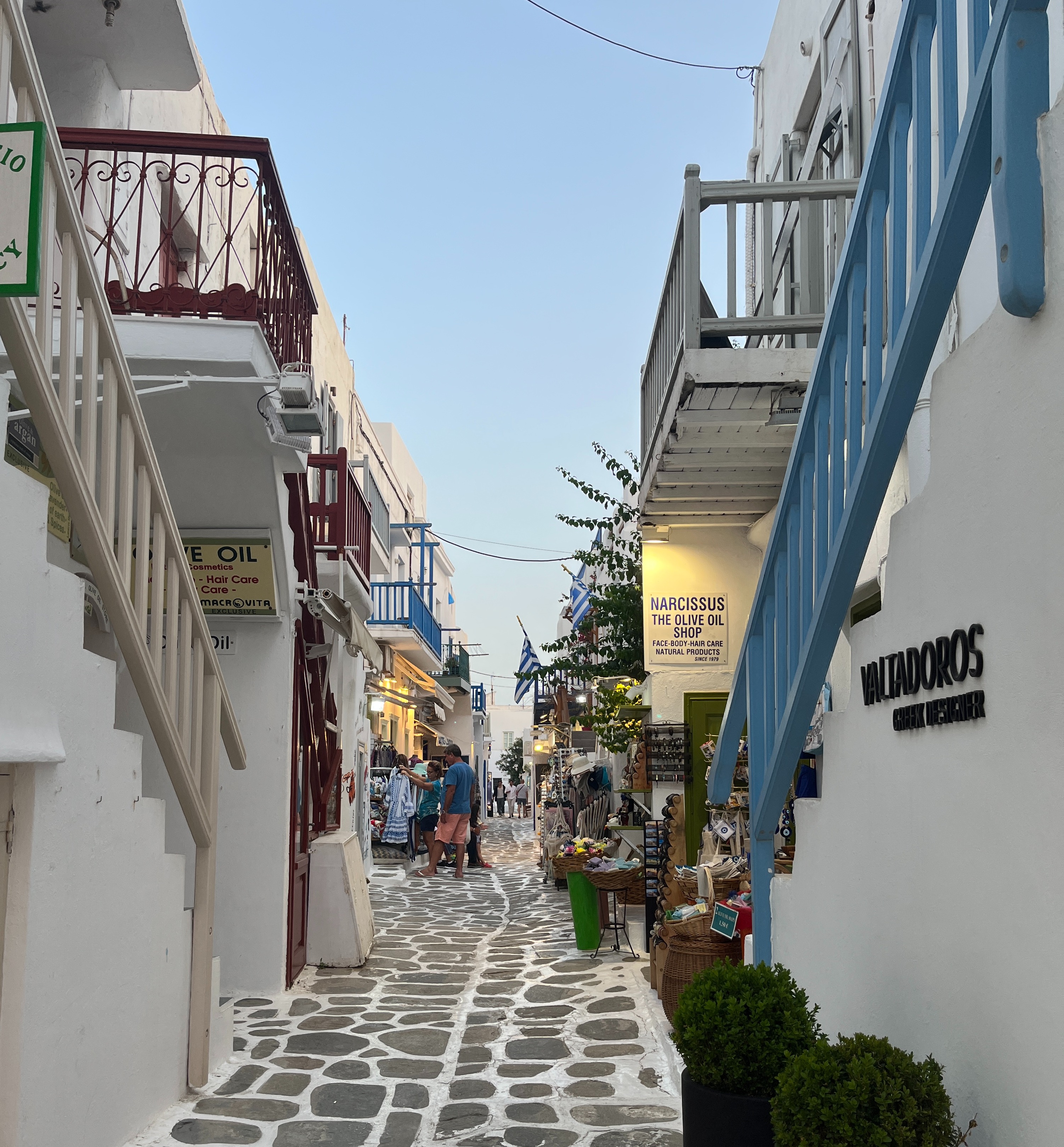 Yo dividiría Mykonos en dos: el 'centro neurálgico' (Little Venice) y el resto de la isla. Little Venice es la zona más cara de toda la isla (por una cerveza te cobraban 6 euros y por una consumición 20) y las únicas tiendas que hay son de marcas bastante conocidas y establecimientos de souvenirs. Es bastante parecido a ciudades españolas con puerto, salvando las distancias de que la estética es completamente diferente y bastante cuidada: todo es blanco y azul, lo que transmite bastante calma.