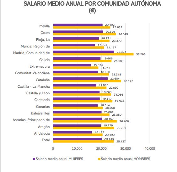 Según el Informe sobre la Brecha Salarial en la Comunidad de Madrid, elaborado por UGT, con datos de la Agencia Tributaria y la Tesorería General de la Seguridad Social, la Comunidad de Madrid es la región con mayor brecha salarial entre hombres y mujeres, con unos salarios un 23,94% superiores en hombres que en mujeres. El salario medio anual de los hombres, en 2022, fue de 33.295€ frente a los 25.324€ que percibieron las mujeres. Ellas cobraron 7.971€ menos.
