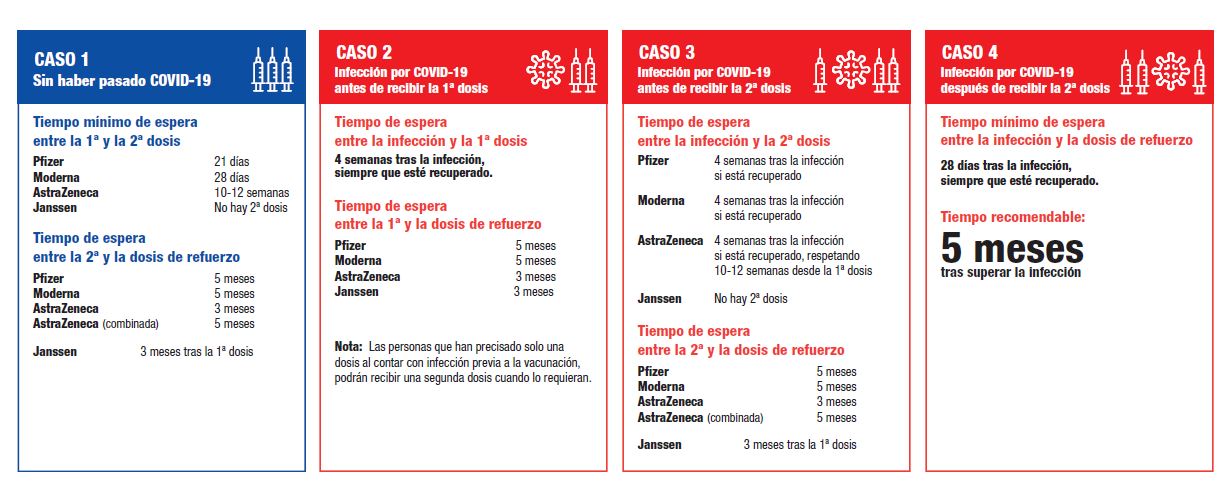 - AstraZeneca: 4 semanas tras la infección si está recuperado, respetando 10-12 semanas desde la 1ª dosis