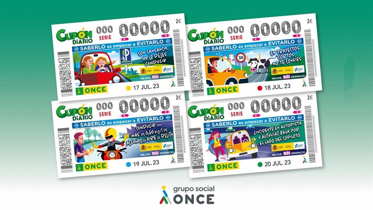 La ONCE emite 20 millones de cupones con consejos de la DGT en materia de Seguridad Vial con consejos de la Dirección general de Tráfico (DGT) en materia de Seguridad Vial. Correspondientes a los días 17, 18, 19 y 20 de julio, estos cupones recorrerán toda España con una frase común que dice ‘Saberlo es empezar a evitarlo’.