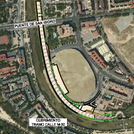 Las obras que se están llevando a cabo en la margen izquierda del río Manzanares (Arganzuela), entre los puentes de Toledo y San Isidro, comprenden el cubrimiento del tramo de la M-30 actualmente en superficie. Las actuaciones se desarrollan en los 620 metros existentes entre las dos bocas de la M-30 soterrada. La obra comprende una superficie total de 20.700 metros cuadrados.