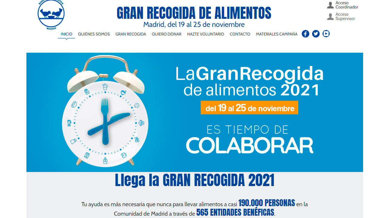 Como cada año, vuelve la Gran Recogida de Alimentos del Banco de Alimentos de Madrid, del 19 al 25 de noviembre, que se llevará a cabo en 27 cadenas y 1.468 establecimientos de Madrid ciudad y otros municipios de la comunidad. Hasta la fecha en la que comienza el periodo de donaciones en las tiendas, se ha iniciado la primera fase de la campaña en la que se necesitan captar 8.500 voluntarios para colaborar en los establecimientos haciendo labores informativas los días 19, 20 y 21 de noviembre con la misma mecánica de donación que en 2020, añadiendo la cantidad que se desee donar al ticket de compra al pasar por caja.
