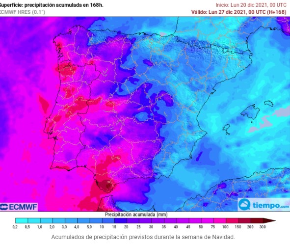 En muchas zonas de la mitad occidental de la península esta semana se acumularán más de 50 l/m2. Además, se prevén registros superiores a los 100 l/m2 en Rías Baixas, Grazalema y Sierra de Gata y de Gredos, pudiendo alcanzarse los 250 litros en aquellos puntos más expuestos a los ábregos.