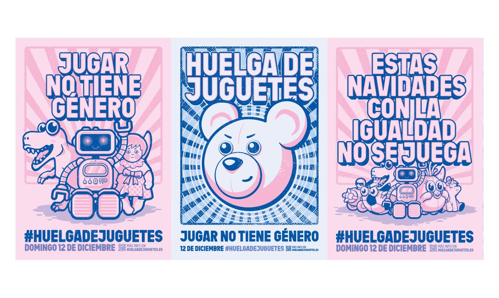 Esta simbólica acción, sin precedentes en España, también se podrá secundar de forma on line a través de las redes sociales publicando una fotografía con la etiqueta #HuelgaDeJuguetes. “Nosotros, aunque seamos de plástico o de peluche, también tenemos nuestro corazoncito. Ha llegado el momento de decir basta. ¿Estáis con nosotros? ¡Sí! ¿Qué somos? ¡Juguetes! ¿Y qué queremos? ¡Igualdad!”, explican en el videocomunicado con el que este jueves se ha dado el pistoletazo de salida a la campaña, que ha estado acompañada de una pegada de carteles simbólica (como los aquí debajo mostrados) en las ciudades de Madrid, Barcelona y Sevilla.